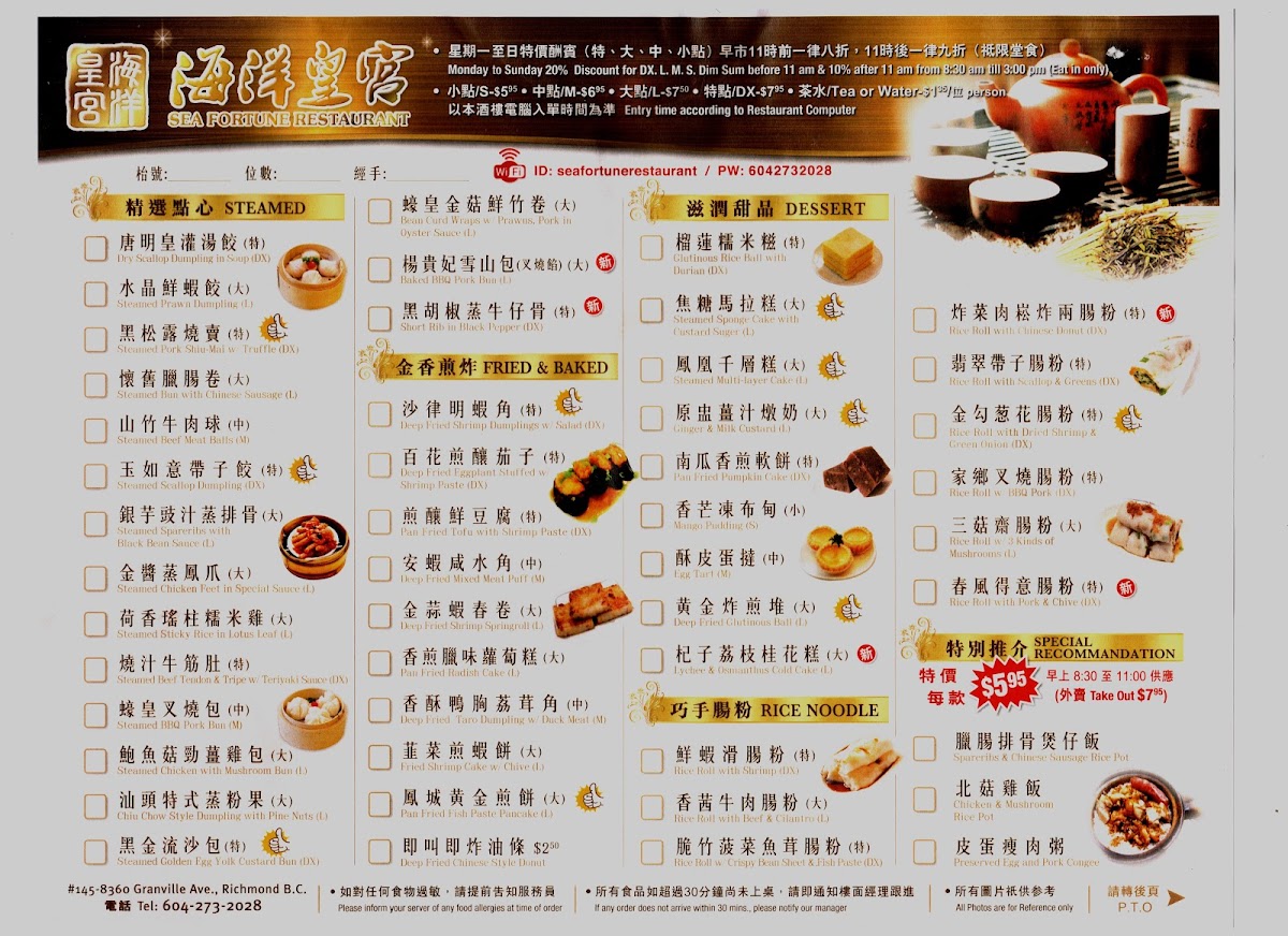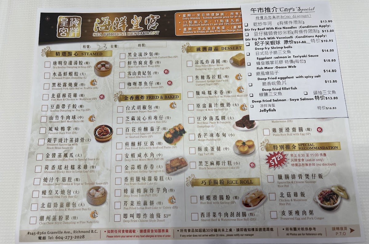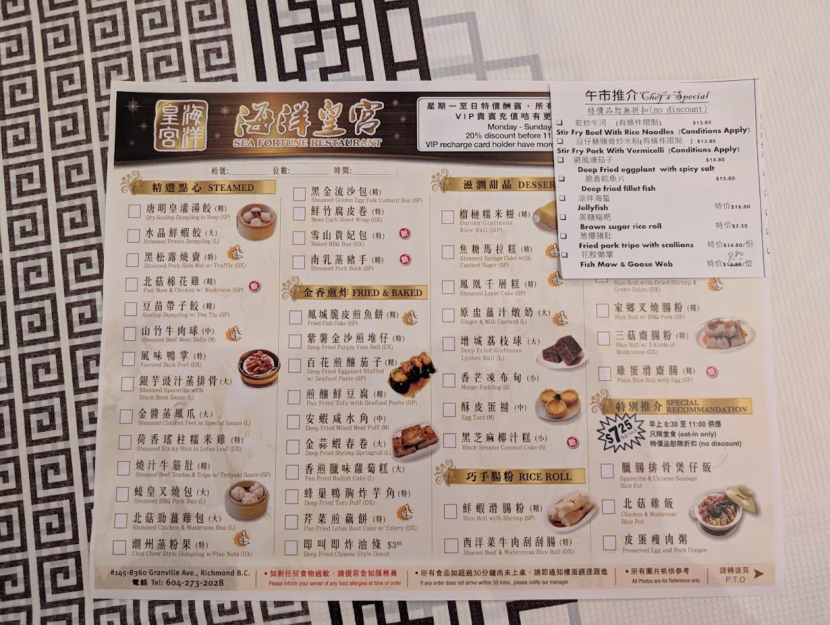 Welcome to Sea Fortune Restaurant, located in Richmond, BC, where culinary craftsmanship meets an inviting atmosphere. This gem offers an extensive menu, perfect for dim sum enthusiasts and food lovers alike. Start your meal with their signature Spicy Beef Brisket with Vermicelli in Pot or indulge in the velvety Organic Pumpkin Fish Congee. The highlights of the menu include freshly steamed delicacies like Truffle Pork Shiu-Mai and Prawn Dumplings, praised for generous portions and authentic flavors.